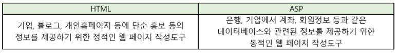 사용자로부터 어떤 내용을 입력받아 데이터베이스에 저장해야 할 경우와 같은건데 이럴 경우는 반드시 ASP를 사용해야만 합니다. 예를 들어 게시판 작성, 파일 업로드, ID 인증 등과 같이 서버에 어떤 정보를 저장하거나 저장된 정보를 이용해 일을 하는 경우에는 ASP를 사용해야만 합니다. 왜냐하면 HTML은 원칙적으로 클라이언트에서 번역되는 문서이기 때문에 서버의 다른 자원에 접근할 수가 없기 때문입니다.