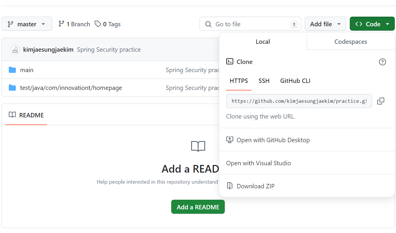 일단 GitHub에서 주소를 code를 눌러 가져옵니다.