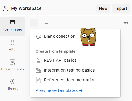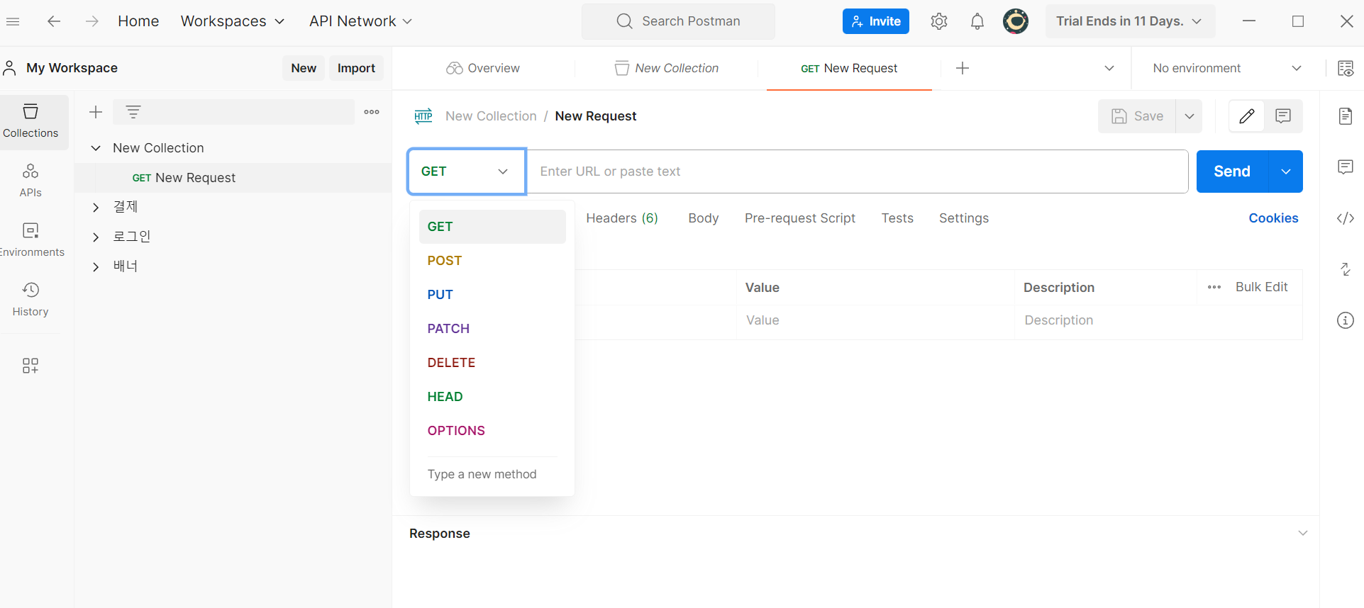 메인 화면이 나오고 Collection에 실행 하고자 하는 request 목록을 만들 수 있다.