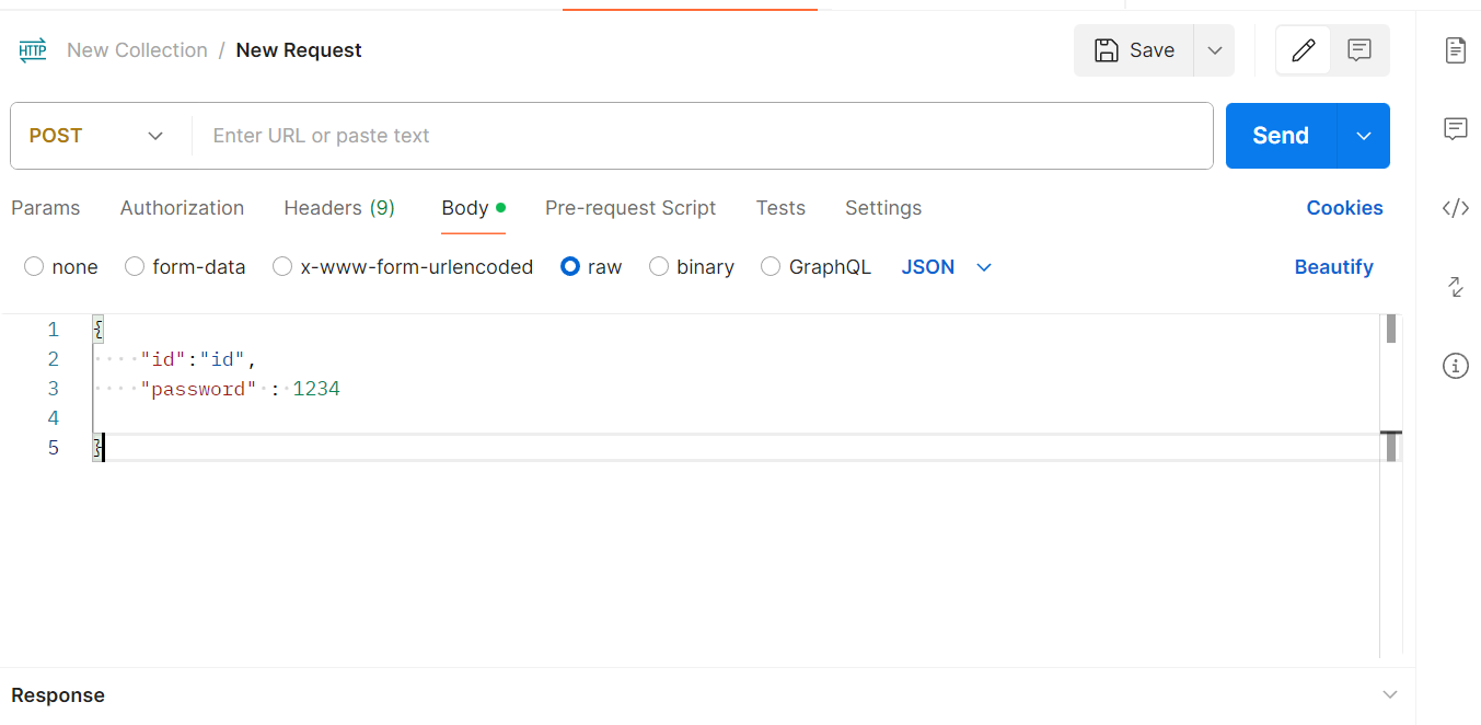 JSON 형식으로 BODY에 보낼 때는 raw를 클릭하면 기본적으로 JSON의 형태를 갖춘다.